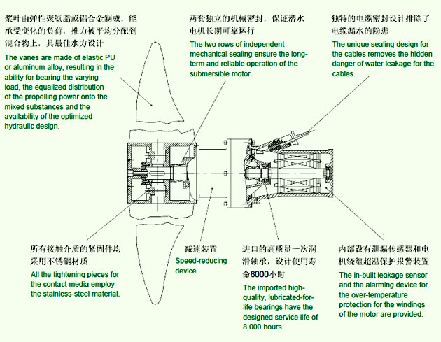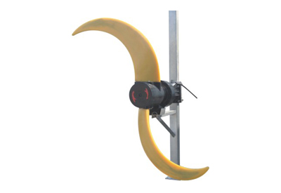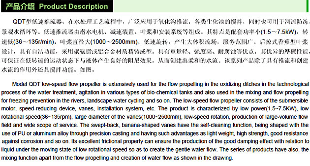 QDT型低速推流器,在水處理工藝流程中,廣泛應(yīng)用于氧化溝推流,各類生化池的攪拌,同時(shí)也可用于河流防凍,景觀水循環(huán)等。低速推流器油潛水電機(jī)、減速裝置、葉槳和安裝系統(tǒng)等組成。其特點(diǎn)是配套功率小(1.5-7.5KW),轉(zhuǎn)速低(36-135r/min),葉槳直徑大(1000-2500mm),低速旋轉(zhuǎn),產(chǎn)生大體積流場(chǎng),服務(wù)范圍廣。后掠式香蕉型葉槳設(shè)計(jì),具有自潔功能,采用聚氨脂或鋁合金材質(zhì)精鑄成型,具有重量輕、強(qiáng)度高、耐腐蝕等優(yōu)點(diǎn),其優(yōu)異的摩擦性能,可保證在低速的運(yùn)動(dòng)狀態(tài)下與液體產(chǎn)生良好的阻尼效果,從而創(chuàng)建出柔和的水流。該系列產(chǎn)品除了具有推流和創(chuàng)建水流的作用外還具有攪拌功能。