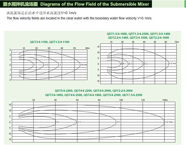 潛水?dāng)嚢铏C(jī)的選型是一項(xiàng)比較復(fù)雜的工作,選型方案的正確與否直接影響到設(shè)備的正常使用,作為選型的原則就是要讓攪拌機(jī)在適合的容積里發(fā)揮充分的攪拌功能,這個(gè)標(biāo)準(zhǔn)一般可用流速來確定。根據(jù)污水處理廠的不同工藝要求,攪拌機(jī)選型的佳流速應(yīng)保證在0.15~0.3m/s之間,如果低于0.15m/s的流速則達(dá)不到推流攪拌的效果,如果超過0.3m/s的流速則會(huì)影響工藝效果且造成浪費(fèi)。所以在選型前,首先要確定潛水?dāng)嚢铏C(jī)運(yùn)用在什么場(chǎng)所,如:污水池、污泥池還是生化池;其次是介質(zhì)參數(shù),如:懸浮物含量、溫度、PH值等;還有水池的形狀,水深甚至安裝方式等都將對(duì)選型產(chǎn)生影響,同時(shí)還應(yīng)考慮到節(jié)能因素,因?yàn)檫@將會(huì)影響到用戶今后的運(yùn)行成本。可參考下面的潛水?dāng)嚢铏C(jī)流場(chǎng)圖。