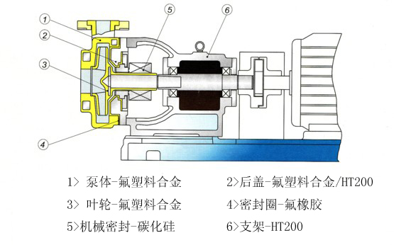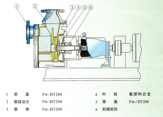 IHF襯氟離心泵按國家標準設計;泵體采用先進的生產工藝以金屬外殼緊襯氟塑料(F46)制造,泵的承重部分為金屬材料具有機械強度高、耐壓性強、抗機械沖擊力優越等優點;主要過流部件葉輪、泵蓋等均采用金屬嵌件外包氟塑料一次性高溫模壓而成;配置外裝式金屬波紋管機械密封,對磨材質:氧化鋁VS四氟、碳化硅VS四氟、硬質合金VS硬質合金,用戶可根據工況要求選擇對磨付。