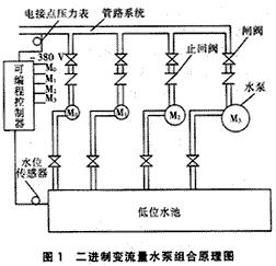 在文獻[1]中提出了一種不使用變頻器(或氣壓罐)的自動穩壓給水方法,即二進制變流量水泵組合穩壓給水方法,現介紹如下: