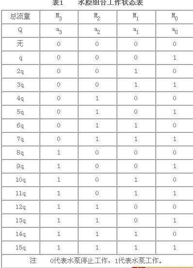 該系統共有四臺水泵M0、M1、M2、M3并聯運行,組合給水。各臺水泵的額定揚程相同,額定流量呈二倍遞變,即如M0的額定流量為q,則其他三臺水泵M1、M2、M3的額定流量分別為2q、4q、8q。