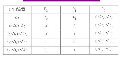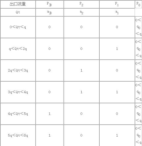 下面描述圖2給水系統的工作原理。對采用開關控制的水泵P1與P2,用數字1表示水泵工作,以數字0表示水泵停止工作,于是P1與 P2的組合工作狀態用一個兩位的二進制數a2a1表示(如表2)。P0采用變頻器連續調節電機轉速,把它與P1P2的組合工作相結 合,則整個給水系統的流量可以在0≤Qt≤4q的區間連續變化(計Qt時近似忽略了由于水泵并聯所造成的流量損失)。表2與表1的不同之處在于:由于變頻調速水泵P0的加入,可以在0≤Qt≤4q的全流量范圍內連續調節給水流量,故理論上可以實現高精度的恒壓控制,而不是表1所描述的在一定范圍內的穩壓控制。同時,與傳統的恒壓變頻調速給水系統相比較,變頻器的設計選用容量可減小一半。因此,本方案兼具了二進制變流量水泵組合方案和典型變頻調速恒壓給水方案的優點。