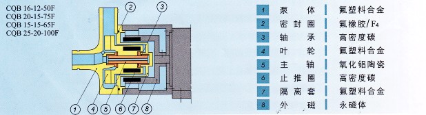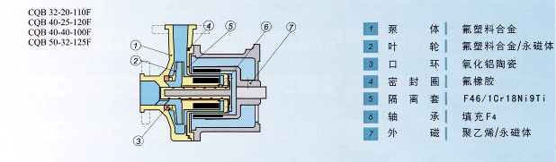 CQB型氟塑料磁力泵是應用現代磁力學原理,利用永磁體實現無接觸間接傳動的一種化工流程泵。當電機帶動外轉子(即外磁鋼)總成旋轉時,通過磁場的作用磁力線穿過隔離套帶動內轉子(即內磁鋼)總成和葉輪同步旋轉,介質完全封閉在靜止的隔離套內,從而達到無泄漏抽送介質的目的,徹底解決了機械傳動泵的軸封泄漏,是全密封、無泄漏、無污染的新型工業泵。