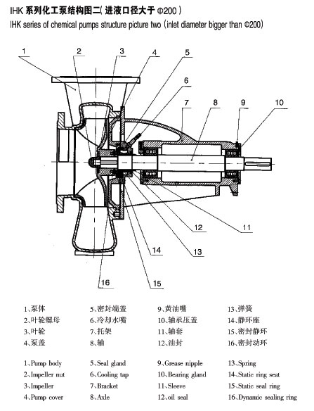 IHK型化工離心泵是在IH型化工泵的基礎上改進而成的,在密封機構上引進了國外先進技術,改變了IH泵只能輸送物理性能類似水的介質(無雜質的顆粒)的弊端,由于密封技術先進、科學、獨特,該泵可輸送含固量高達35%以下的物料;在正常情況下連續工作8000小時無泄漏,是IH泵密封效果的3-5倍,又因葉輪為開式結構,所以不會因介質含固量高而堵塞,該泵是目前化工行業輸送各種物料的理想的先進設備。