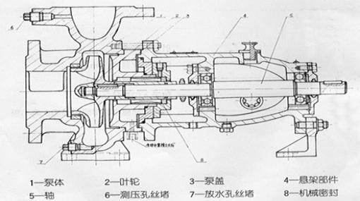 ISR系列單級單吸熱水離心泵的主要零件有泵體、葉輪、泵蓋、懸架部件,機械密封部件、軸等。該系列泵為后開門結構,其優點是轉子部件檢修或更換無須拆卸管道,轉子部件由懸架支撐哲(請參考ISR泵結構圖)。泵軸向力的平衡,軸向力較大的泵,葉輪設有平衡孔,其余軸向力由軸承承受。軸封形式采用不平衡單端面機械密封,軸封室外設有水冷卻套,可以通過泵側面1/4管接口接通外來冷水,對軸封進行冷卻。傳動方式,泵的傳動是通過聯軸器與電機直聯。從傳動方向看,泵為順時針旋轉。