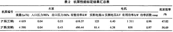 有效功率是水泵傳給水的凈功率。也就是水泵在單位時間內,給多少重量的水提升了多少高度。水泵效率是有效功率與軸功率之比。效率愈高。表示水泵本身損失的功率愈少。從表2數據中可以看出,2泵在開工頻冷水泵時出口壓力0.53MPa、水泵有效功率616.37kW。電機有用功率1311kW、功率因數cos<P0.96、機泵效率47.02%。在變頻狀態下冷水泵出口壓力調至供水壓力下限0.43MPa、水泵有效功率486.44kW、電機有用功率858kW、功率因數cosq)0.97、機泵效率56.69%。數據說明變頻狀態下變頻泵在出El壓力降低時。電機的有用功率有所下降,水泵的有效功率也隨之下降。但電機電流降低了約40%,同時功率因數和機泵效率卻有所上升,表明在滿足供水壓力、流量的前提下。使用變頻泵和工頻泵并聯運行,可比兩臺工頻泵并聯運行節能。見表3。