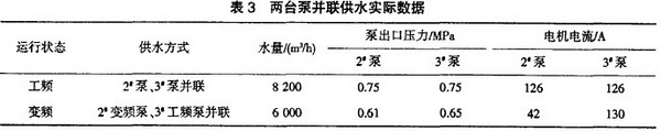 從表3兩臺泵并聯供水實際數據中可以清楚看到在工頻狀態下。泵出El壓力都超出了正常運行壓力,已致引起機泵振動和發熱。而在 泵變頻狀態下與3#工頻泵并聯運行時,泵出El壓力有所降低。2變頻泵電機電流則大幅下降。因此可以得出以下結論: