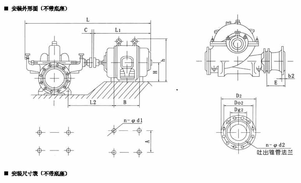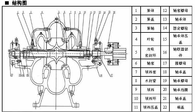 S、SH型單級雙吸泵殼中開之離心泵,供抽磅清水或物理化學性質類似于水的其它液體之用。被輸送液體溫度不得高于80℃。