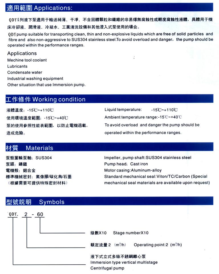 QDY不銹鋼多級液下泵主要零部件如葉輪、導流器、泵軸用不銹鋼制造,不銹鋼多級液下泵所有過流部件、觸液部件均為不銹鋼制造,具有良好的耐腐蝕性能,采用硬質合金軸承及機械密封,剛性聯軸器傳動,具有體積小、重量輕、抗腐蝕、振動小、噪音低、占地面積小、使用壽命長,外形美觀等特點,特別是高效、節能等優點。