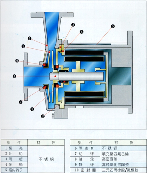 CQ型不銹鋼磁力泵是利用永磁聯軸器工作原理無接觸的傳遞扭矩的新型泵,當原動機帶動外磁鋼轉子時,通過磁場的作用驅動內磁鋼轉子同步旋轉,而內磁鋼轉子和葉輪連成一體,從而達到無接觸帶動葉輪轉動之目的。由于液體被封閉在靜止的隔離套內,所以磁力泵是一種全封閉、無泄漏的泵型,因此完全杜絕了機械密封離心泵不可避免的跑、冒、滴、漏的弊病。