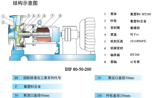 IH型化工泵為單級單吸懸臂式離心泵。其標記、額定性能點和尺寸等效采用國際標準ISO2858-1975(E)、是國家機械工業部確定取代F型耐腐蝕離心泵的更新換代產品。能滿足化工流程中輸送有腐蝕性粘度類似于水的液體,其輸送介質的溫度一般為-20至120度,必要時采用適當冷卻措施,輸送的介質溫度可更高達200度以上。