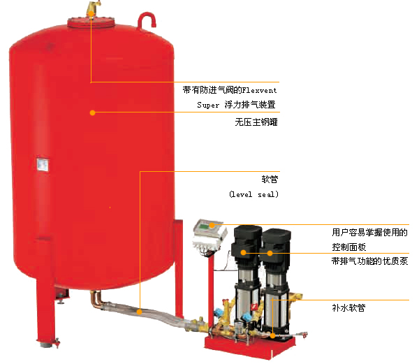 6、在熱水采暖及空調系統中起膨脹水箱和自動補水作用;