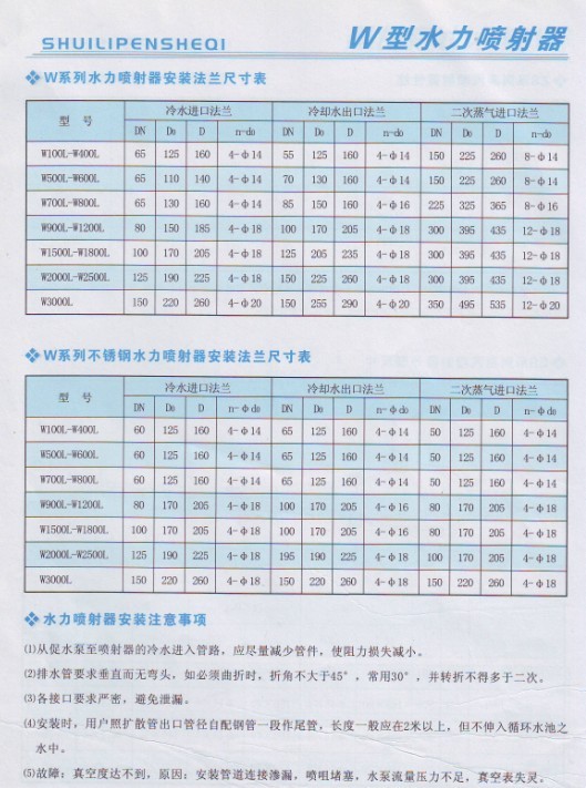 W-系列水力噴射器是一種具有抽真空、冷凝、排水等三種有效功能的機械裝置。它是利用一定壓力的水流通過對稱均布成一定傾斜度的噴咀噴出。聚合在一個焦點上,由于噴射水流速度較高,于是周圍形成負壓使器室內產生真空,另外由于二次蒸汽與噴射水流直接接觸,進行熱交換,絕大部分的蒸汽凝結成水,小量未被冷凝的蒸汽與不凝結的氣體亦由于與高速噴射的水流相互摩擦,混合與擠壓,通過擴壓管被排除,使室內形成更高的真空。