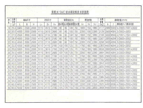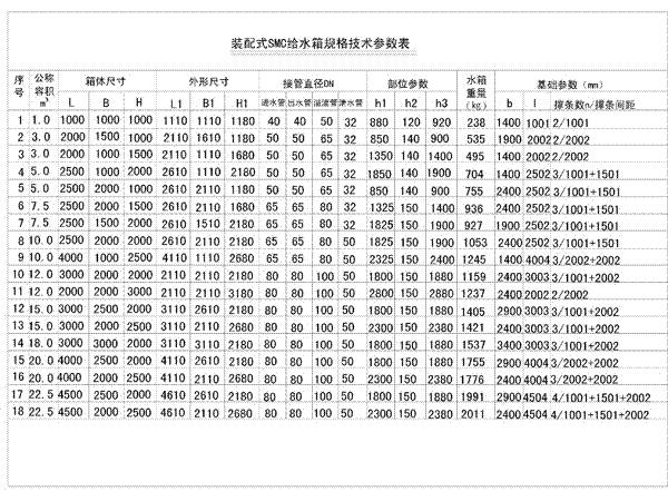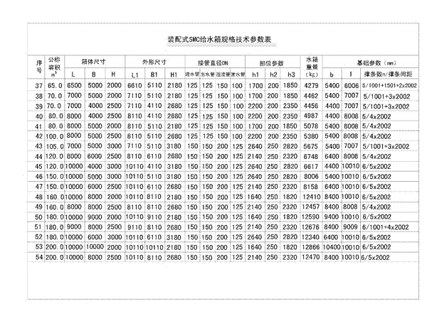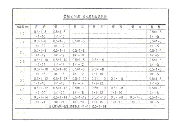 注:1、裝配式SMC給水箱單板型號為MT-SB-XxY-Z其中(X為單板長度m,Y為單板狂度m,Z為單板厚度mm),表中各種板型省略“MT-SB-”.