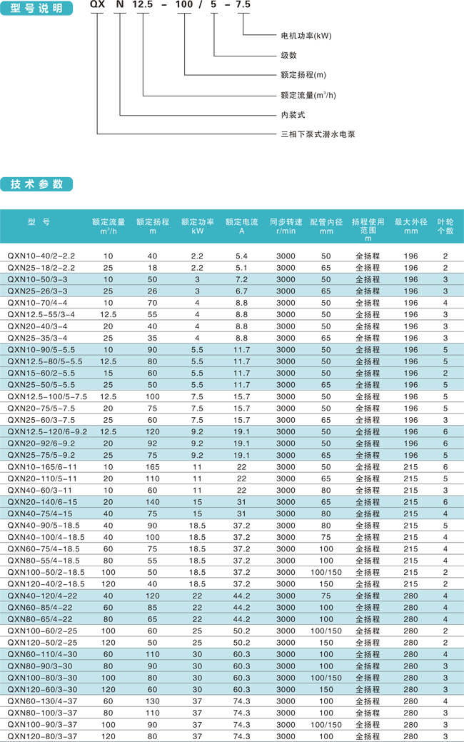 全揚程QXN型內裝式潛水電泵(以下簡稱電泵),電泵由水泵、密封、電動機、冷卻水套組成,電動機位于電泵上部,為三相異步電動機結構;水泵位于電泵下部,為多級離心式葉輪徑向導葉結構,具有揚程高外形小的特點,水泵與電機之間采用兩道獨立的機械密封,各固定止口密封處采用“O”形耐油橡膠密封圈作靜密封,電動機外套有鋼制冷卻水套,電泵工作時,水流從水套和電動機之間空隙通過,對電動機和軸承有良好的冷卻作用,因此電泵上部可以露出水面工作。電泵轉軸經鍍硬鉻處理,不易磨損、腐蝕,且便于葉輪的維修拆卸。