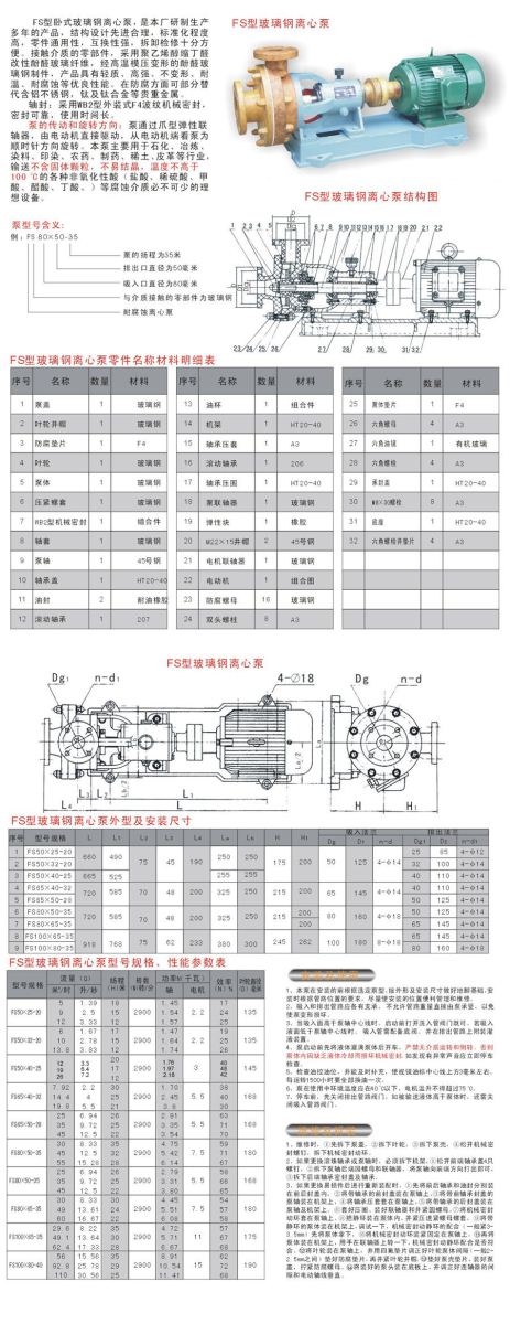 FS型臥式玻璃鋼離心泵,結構設計先進合理,標準化程度高,零件通用性,互換性強,拆卸檢修十分方便。接觸介質的部件,采用聚乙烯醇縮丁醛改性酚醛玻璃纖維,經高溫模壓成形的酚醛玻璃鋼制件。FS型臥式玻璃鋼離心泵產品具有輕質、高強、不變形、耐溫、耐腐蝕等優良性能。FS型臥式玻璃鋼離心泵在防腐方面可部分替代含鉬不銹鋼,鈦及鈦合金等貴重金屬。