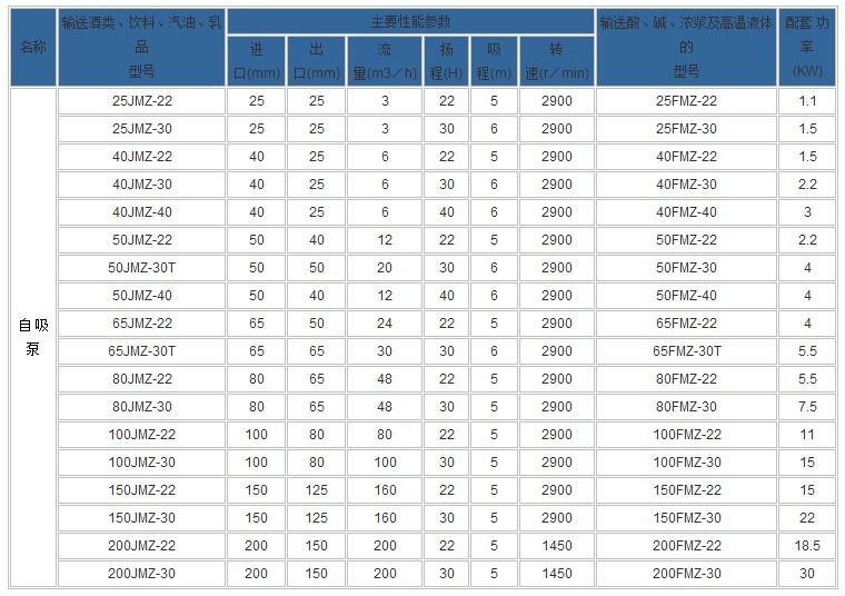 JMZ、FMZ自吸酒泵-自吸化工泵性能參數: