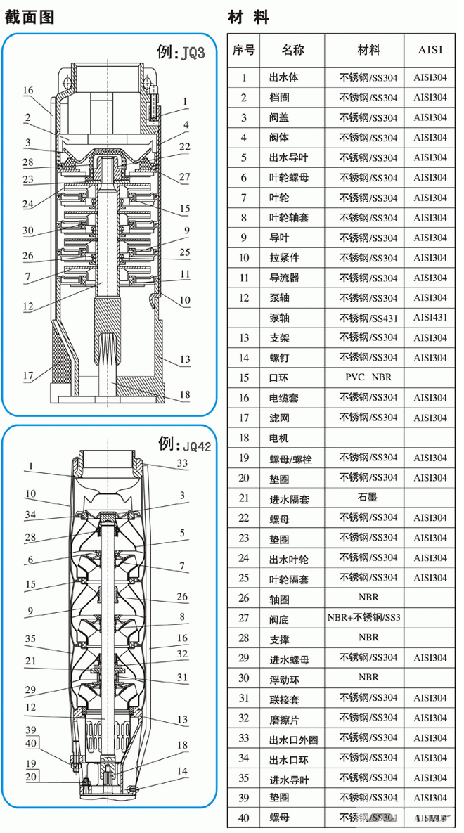 QJ系列不銹鋼304多級深井潛水泵結構圖