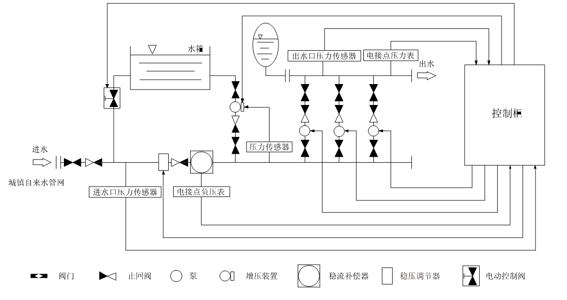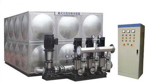 箱式管網(wǎng)疊壓供水設(shè)備(無負(fù)壓增壓水箱)是由水箱,防倒流裝置(根據(jù)需要設(shè)置),防負(fù)壓裝置,水泵機(jī)組,限壓保護(hù)裝置,膨脹罐(根據(jù)需要設(shè)置),控制儀表,控制柜,閥門,管路系統(tǒng),配套附件等組成,從供水管網(wǎng)直接吸水,通過壓力傳感器檢測出壓力,將檢測值和設(shè)定值進(jìn)行比較,計(jì)算出在市政自來水管網(wǎng)的原有壓力的基礎(chǔ)上需要增加的壓力值,確定水泵投入臺(tái)數(shù)和變頻器輸出頻率,調(diào)整水泵的轉(zhuǎn)速以符合用水曲線實(shí)現(xiàn)恒壓供水或變壓供水。水箱式管網(wǎng)疊壓供水設(shè)備(自動(dòng)增壓水箱)大程度利用了市政管網(wǎng)自來水的原水壓力,對市政管網(wǎng)不產(chǎn)生負(fù)壓,系統(tǒng)會(huì)定時(shí)定量或在管網(wǎng)供水量不足時(shí)自動(dòng)切換到水箱內(nèi)吸水,設(shè)備選用不銹鋼水箱和管件,減少了用水的二次污染,是新一代供水領(lǐng)域的節(jié)能產(chǎn)品。