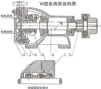 4、W型旋渦泵的密封形式有軟填料密封和單端面機械密封。除WB和WM型泵用單端面機械密封外泵出廠時一律裝軟填料密封。如用戶需要其它型式的軸封要在訂貨時說明。