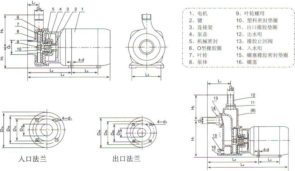 防爆直聯式半開式葉輪食品級不銹鋼自吸泵安裝尺寸結構圖