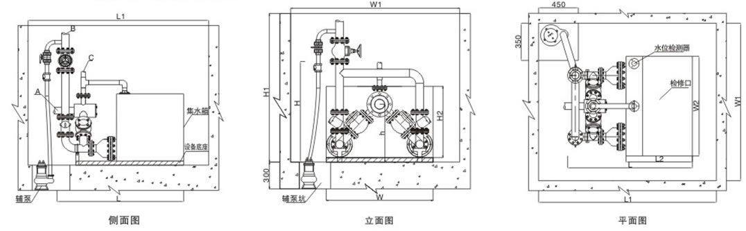 當設備安裝在設備坑內時,設備應配置一臺輔助水泵,目的是為了便于排出意外產生的積水,輔助水泵安裝在設備旁邊的預制集水槽內。