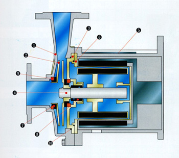 內磁鋼總成:304不銹鋼+磁鐵、隔離套:304不銹鋼、外磁鋼總成:鑄鋼+磁鐵