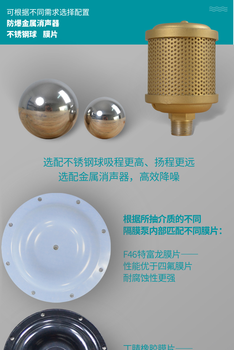 題外話:有的用戶需要氟塑料隔膜泵,你一定要清楚:您需要的是膜片要氟塑料的,還是泵體要氟塑料?兩者價格差異巨大。一般性料體,是不用選泵體材質氟塑料的,膜片配氟塑料即可。