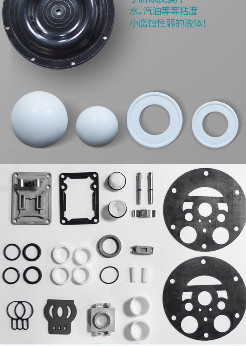 丁青橡膠、三道橡膠:耐磨損,耐輕微腐蝕,價格便宜。(鑄鐵隔膜泵,鋁合金隔膜泵標準配置)