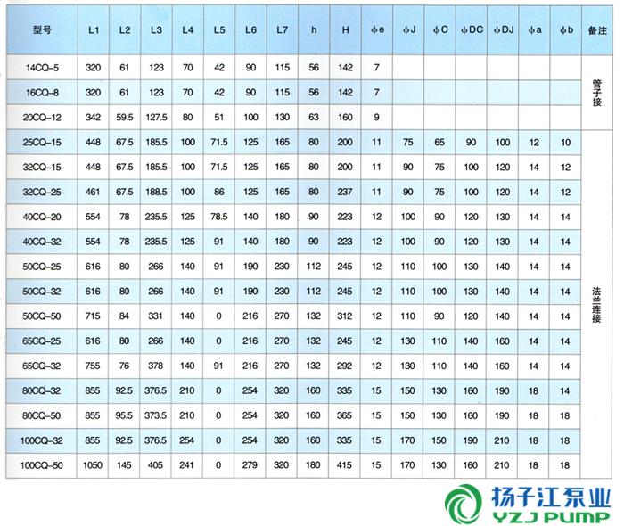 二、CQ型磁力驅動泵安裝尺寸表: