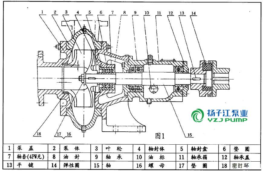 本型泵主要由:泵蓋(1),泵體(2),葉輪(3),軸(15),軸封體(4),軸承箱(11))及聯軸器部件等組成〈見圖1:結構圖〉