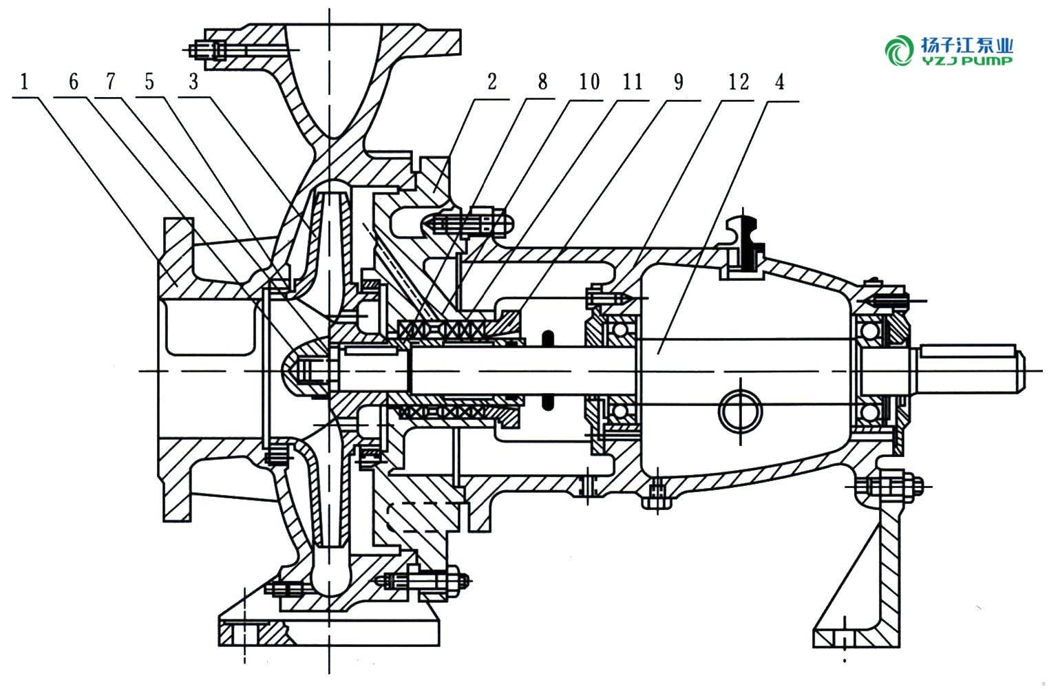 IS、IR型泵系根據國家標準ISO2858所規定的性能和尺寸設計的,主要由泵體(1)、泵蓋(2)、葉輪(3)、軸(4)、密封環(5)、軸套及懸架軸承部件(12)等所組成。