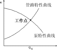 在泵葉輪轉速一定時,一臺泵在具體操作條件下所提供的液體流量和壓頭可用qV-H曲線上的一點來表示。至于這一點的具體位置,應視泵前后的管路情況而定,討論泵的工作情況,不應脫離管路的具體情況。 |
