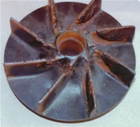 (1)汽蝕現象 對如右圖所示的入口管線,在0-0(位能基準面)和K-K間列柏努利方程,得: 在貯槽液面上方壓力p0一定的情況下,若增加泵的安裝高度ZK(即Hg),則葉輪中心K處的壓力pK必然下降。當ZK增加到使pK下降至被輸送液體在操作溫度下的飽和蒸汽壓時,則被輸送流體在葉輪中心處發生汽化,產生大量汽泡;汽泡在由葉片中心向周邊運動時,由于壓力增加而急劇凝結,產生局部真空,周圍液體以很高的流速沖向真空區域;當汽泡的冷凝發生在葉片表面附近時,眾多液滴尤如細小的高頻水錘撞擊葉片。此種現象稱作“汽蝕現象”。 離心泵在汽蝕狀態下工作時,泵體振動并發出噪音;壓頭、 流量大幅下降,嚴重時不能輸送液體;時間長久,在水錘沖擊和液體中微量溶解氧對金屬化學腐蝕的雙重作用下,葉片表面出現斑痕和裂縫,甚至呈海綿狀逐漸脫落(見右圖)。 通過以上討論可以看出,安裝高度過高將會導致葉輪中心處的壓力過低,從而發生汽蝕。只要泵的實際安裝高度低于允許安裝高度,則操作時就可避免發生汽蝕現象。
