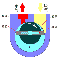 兩個旋片把轉子、泵腔和兩個端蓋所圍成的月牙形空間分隔成A、B、C三部分,如圖所示。當轉子按箭頭方向旋轉時,與吸氣口相通的空間A 的容積是逐漸增大的,正處于吸氣過程。而與排氣口相通的空間C的容積是逐漸縮小的,正處于排氣過程。居中的空間B的容積也是逐漸減小的,正處于壓縮過程。由于空間A的容積是逐漸增大(即膨脹),氣體壓強降低,泵的入口處外部氣體壓強大于空間A內的壓強,因此將氣體吸入。當空間A與吸氣口隔絕時,即轉至空間B的位置,氣體開始被壓縮,容積逐漸縮小,后與排氣口相通。當被壓縮氣體超過排氣壓強時,排氣閥被壓縮氣體推開,氣體穿過油箱內的油層排至大氣中。由泵的連續運轉,達到連續抽氣的目的。如果排出的氣體通過氣道而轉入另一級(低真空級),由低真空級抽走,再經低真空級壓縮后排至大氣中,即組成了雙級泵。這時總的壓縮比由兩級來負擔,因而提高了極限真空度。