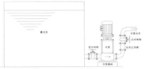 蓄水池自灌引水方式布置的水泵運行原理如下圖,一般水泵與蓄水池均布置于地面以上,蓄水池內(nèi)水位必須高于水泵出口端排氣孔,以保證水泵起動之前蓄水池內(nèi)的水能自動灌入水泵泵腔,并將泵腔內(nèi)的空氣排盡。這種安裝方式水泵的進水口需安裝一只閥門,當水泵故障需要拆下維修或更換時,可將閥門關閉,以防止蓄水池內(nèi)水外泄。