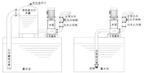 蓄水池吸上引水方式布置的水泵運行原理如下右圖,蓄水池一般建于地面以下,而水泵位于地面上,蓄水池水位低于水泵進水口,因此,蓄水池內(nèi)的水不能自動灌入水泵泵腔,為了使水泵正常工作,在水泵起動前必須人工將水灌滿水泵泵腔和水泵吸水管,將泵腔內(nèi)空氣排盡。所以蓄水池內(nèi)水泵的吸水管底端需安裝底閥,但由于市場上一般底閥密封性不是很好,加之水中的顆粒容易進入底閥使底閥關閉不嚴,所以目前采用安裝底閥方式越來越少,大多改為加裝引水罐形式(下左圖),由于加裝了引水罐,不需人工灌引水,且無底閥,使水泵吸水口由負壓吸水變?yōu)檎龎何运眠\行可靠性要高得多。