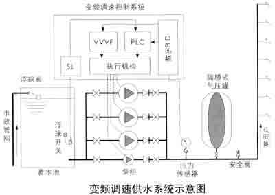 2、該設備由原裝進口 交流變頻調(diào)速器、工業(yè)級可編程控制器、數(shù)字PID調(diào)節(jié)器、引進低壓電器、壓力傳感器、液位控制器及電機泵組構成閉環(huán)調(diào)節(jié)變頻調(diào)速供水控制系統(tǒng)。該系統(tǒng)可根據(jù)管網(wǎng)瞬時壓力變化,自動調(diào)節(jié)某臺水泵電機的轉速和多臺水泵電機的投入和退出,滿足用戶恒壓變量供水及變壓變量供水的需要,使供水管網(wǎng)末端壓力保持恒定,使得整個供水系統(tǒng)始終保持高效節(jié)能的佳狀態(tài)。