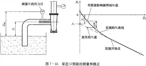 化工泵的葉輪旋轉,影響葉輪前吸入管路中的液體也旋轉,即產生預旋,如圖7-33所示。預旋在大流量時很小,幾乎測不出來,小流量時較強。預旋使管路外周的壓力增高.由此測量的泵進口壓力偏高,從而降低了泵的揚程,并可能使泵的流量揚程曲線出現駝峰。這種揚程下降和駝峰是一種假象,應予修正。其修正方法如下:選擇規定的進口測量截面到上游較遠處確認沒有預旋影響的另一位置(如泵吸水池)之問這段管路,測試并做出蘭段管路水力損失和流量的關系曲線H1=f(Q),因為水力損失和流量的平方成比例,即H1=KQ2。用預旋影響甚微的大流量點的流量Q求出K值(K=H1/Q2)。然后用此K值向小流量側計算出不同流量的H。值,畫出計算的H1=f(Q)曲線。兩曲線間的差值即是修正值,應將該修正值加在原測試中對應流量點的揚程上。