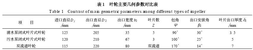 通過對一個實例的設計來進行分析、比較, 其設計參數為: 流量Q = 145m 3/h , 揚程H = 10m , 轉速n =1 450 r/m in, 電機功率P 電機= 7. 5 kW , 要求通過固體顆粒的大直徑為45 mm。為了便于說明問題, 對于閉式葉片式葉輪分別給出了按普通清水泵及污水泵的設計結果。所有的水力設計均采用速度系數法進行, 其中閉式葉片式葉輪的設計方法參見文獻, 雙流道葉輪的設計方法參見文獻。表1 列出了上述葉輪主要幾何參數的對比情況。