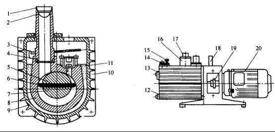 ![]() 圖1 旋片式真空泵結(jié)構(gòu)示意圖 1-進(jìn)氣管;2-濾網(wǎng);3-擋油板;4-進(jìn)氣管“O”形;5-旋片彈簧;6-旋片; 7-轉(zhuǎn)子;8-定子;9-油箱;10-真空泵油;11-排氣閥門;12-放泊螺塞; 13-油標(biāo);14-加油螺塞;15-氣鎮(zhèn)閥;16-減霧器;17-排氣管; 18-手柄;19-聯(lián)軸器;20-電機(jī) |