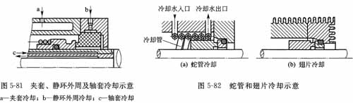①間接冷卻 間接冷卻有密封腔夾套冷卻、靜環外周冷卻、軸套冷卻和換熱器冷卻等方式。換熱器冷卻中有離心泵密封腔內置式換熱器和外置式冷卻器、蛇(盤)管冷卻器、套管冷卻器、翅片冷卻器以及缺水地帶用的蒸發冷卻器。常用的傳熱介質是水、蒸汽和空氣。圖5-81和圖5-82為幾種間接冷卻的示意圖。