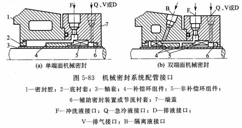 為了防止注入流體的泄漏,需要采用輔助密封,如襯套密封、油封或填料密封。急冷或阻封流體一般用水、蒸汽或氮氣。液體的壓力通常為0.02~0.05 MPa,進出口的溫差控制在3~5℃為宜。圖5-83為典型機械密封系統配管接口,其中包含急冷(阻封)接口及密封急冷液的輔助密封。