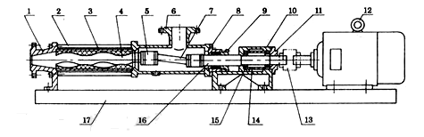 1 出料腔 2 拉桿 3 螺桿膠套 4 螺桿軸 5 萬向節總成 6 吸入口體