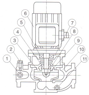 1、取壓閥 2、排氣閥 3、葉輪 4、機械密封 5、軸承 6、電機 7、聯體座 8、泵蓋 9、葉輪螺母 10、泵體 11、放水閥