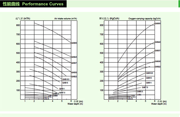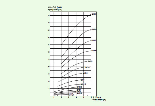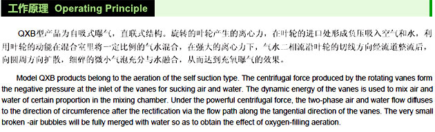 QXB型潛水離心式曝氣機采用電機和葉輪直接傳動,利用葉輪旋轉所產生的離心力排開周圍水形成低壓區吸入水流同時,在葉輪進口處制造真空而吸入空氣,在混氣室中氣與水充分混合形成均勻的氣水混合液,在離心力作用下快速排出。由于水流噴射極強,造成有效的水流循環,使空氣被剪切成大量的微小氣泡。極大提高了其表面積,且由于氣泡上升緩慢使空氣中大量的氧溶于水中,使得該機動力效率優于其它種類的曝氣機。