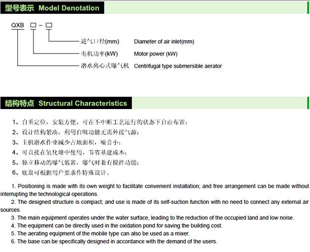 QXB型潛水離心式曝氣機用于各種污水處理工程中生化處理工藝的曝氣池、曝氣沉砂池、預曝氣池、好氧硝化池曝氣充氧混合及養殖塘增氧。