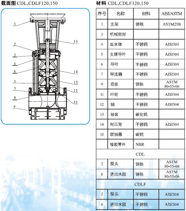 CDLF系列輕型不銹鋼立式多級管道泵(以下簡稱泵)是吸取了國內外先進技術而設計制造的非自吸立式多級管道泵,采用標準立式電機和快裝式機械密封,更換非常方便。泵的過流部分均采用不銹鋼(304\316)材料制成,可適用于輕度腐蝕性介質。該產品可替代國外CR、CRN等同類產品。產品投放市場后,以其高效節能、質量可靠、使用范圍廣等特點,深受廣大用戶的喜愛。